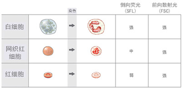 网织红细胞(reticulocyte,Ret,RET)是介于晚幼红细胞和成熟红细胞之间的过渡细胞,略大于成熟红细胞(直径8.0~9.5 微米),其胞质中残存的嗜碱性物质RNA经碱性染料(如煌焦油蓝、新亚甲蓝等)活体染色后,形成蓝色或紫色的点粒状或丝网状沉淀物。网织红细胞自骨髓释放到外周血液后仍具有合成血红蛋白的能力,约1~2天后,过渡为成熟红细胞。