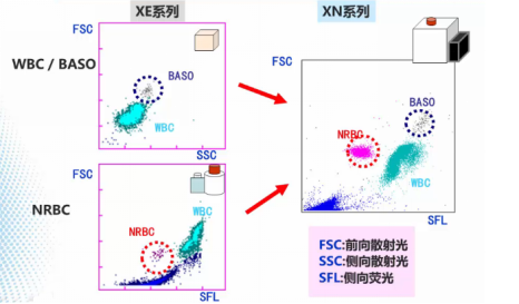 此外,XN机型的试剂开发中做了调试,XE溶血素中只有阴离子表面活性剂,而WNR溶血素中还加入了阳离子表面活性剂,从而区分NRBC和WBC,并解决了脂肪滴的问题。