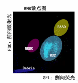 由于嗜碱粒细胞的形态在溶血素中保持不变,所以它的细胞体积最大,核酸含量最多,因此在WNR通道散点图中位于右上方,除了嗜碱粒细胞以外的白细胞在溶血素的作用下发生了皱缩所以细胞体积变小,核酸含量降低,因此位于嗜碱粒细胞的左下方,由于有核红细胞的胞浆和核仁都比白细胞少,在溶血素的作用下以裸核形式存在,所以位于散点图的左侧。
