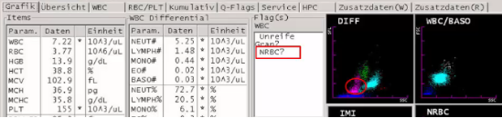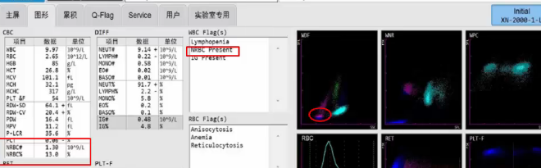 如图右侧DIFF散点图上淋巴细胞下方红色散点为有核红细胞,仪器给出了IP信息:NRPC?白细胞计数结果为7.22×103/μL