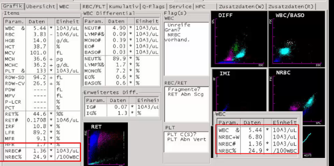 此时加做NRBC通道,结果如图所示,NRBC#:1.367.22×103/μL,NRBC%:24.9/100WBC,WBC&(经NRBC修正后的白细胞总数 ):5.44×103/μL,NRBC+W(未经NRBC修正过的白细胞总数):6.80×103/μL