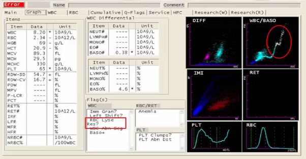 如图BASO散点图上方有胡须状白色散点,同时仪器给出难容红细胞报警,白细胞计数结果为8.20×103/μL,service界面diff通道白细胞结果为3.4×103/μL,与BASO通道结果相差太大,所以仪器给出了Error报警,推片镜检后,WBC镜下计数结果和DIFF通道结果较为接近,所以最后以DIFF通道WBC结果报告。
