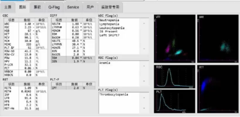同一个标本放到XN仪器上检测的结果如下图,仪器并没有难容红细胞相关报警提示,WBC计数结果与XE机型DIFF通道相同,service界面中WNR通道白细胞计数为3.388×1012/L,WDF通道白细胞计数为3.382×1012/L,两个通道结果接近,比值为0.99.