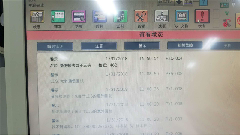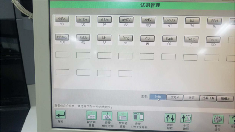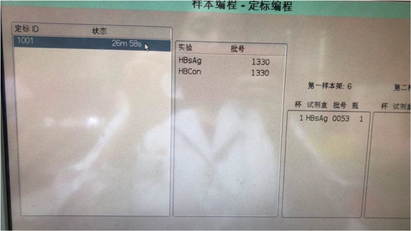 乙肝表面抗原试剂:批号1330,上机后试剂界面显示计数100个,状态未定标,效期是2018年10月30日,上机无报警,如下图: