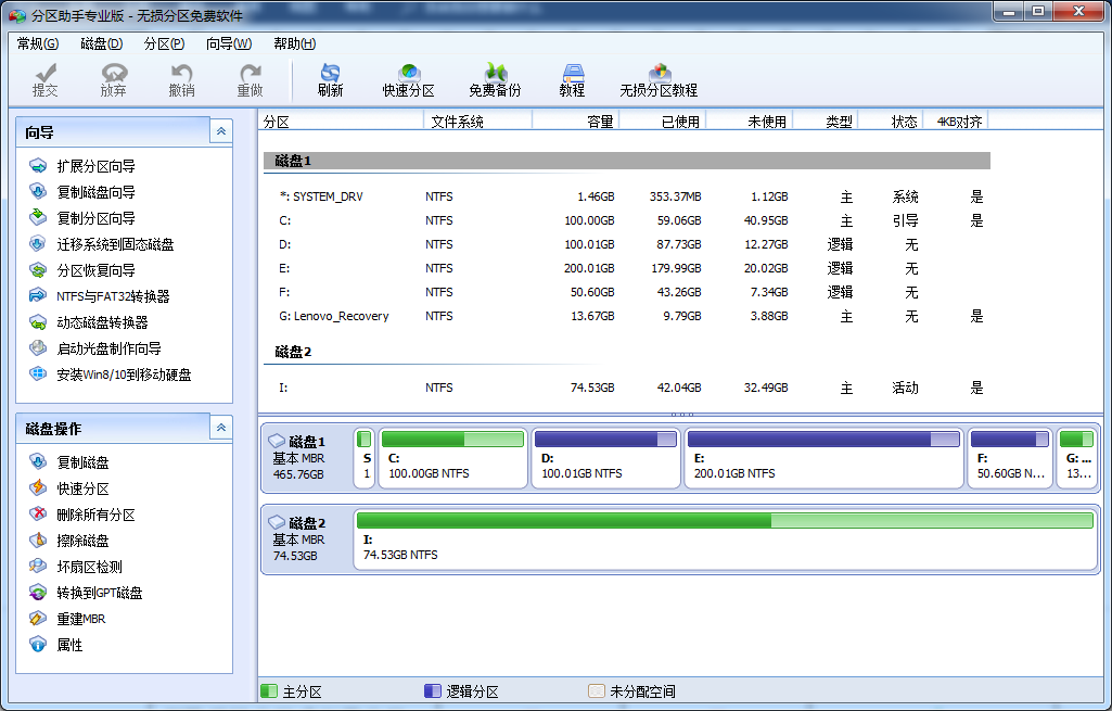 在它的帮助下,您可以无损数据地执行调整分区大小、移动分区位置、复制分区、快速分区、复制磁盘、合并分区、切割分区、恢复分区、迁移操作系统等操作,是一个不可多得分区工具。