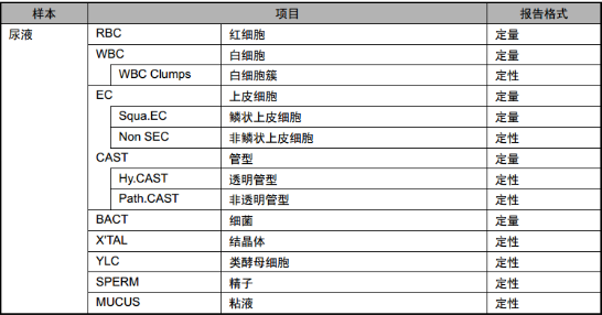 该产品测量项目中,包括6个定量项目:红细胞、白细胞、上皮细胞、鳞状上皮细胞、管型、细菌和8个定性项目:白细胞团、非鳞状上皮细胞、透明管型、非透明管型、结晶体、类酵母细胞、精子、粘液。