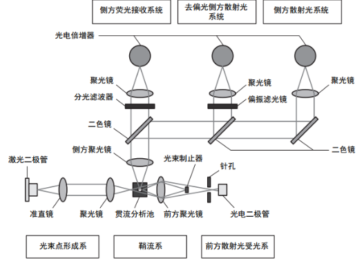 光学系统包括蓝光半导体激光(波长:488nm)、贯流分析池、收集器模块和检测器模块。