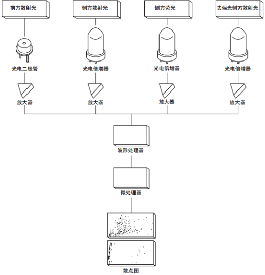 由于侧方散射光和侧方荧光和去偏光侧方散射光较弱,因而使用了高灵敏度的光电倍增器作为光电检测器。利用金属的光电效应,光电倍增器可吸收光电表面 (阳极)上的光子能量并发射光电子。发射的光电子在施加电压的作用下加速,会产生大量次级电子,从而产生倍增效果。这样,侧方荧光即可在转换为电信号前被明显放大。