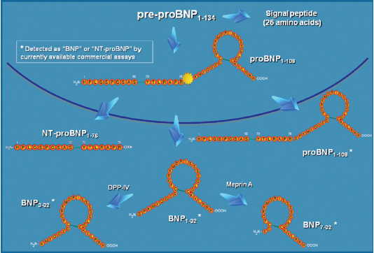 心肌细胞受到压力/牵拉刺激后,即心室容积扩张、压力负荷增加时,首先形成一个含134个氨基酸的B型利钠肽原前体(pre-proBNP),随后蛋白酶切掉N端26个氨基酸的信号肽变成含有108个氨基酸的B型利钠肽原(proBNP),后者在内切酶作用下等摩尔地裂解为一个N端含有76个氨基酸的NT-proBNP1-76,和一个环状结构含有32个氨基酸的BNP77-108。两者主要由心室肌产生并分泌入血,心室肌无存储BNP和NT-proBNP的功能。心房肌也可产生一定量的BNP和NT-proBNP。