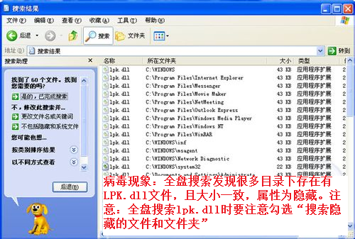 如果您对系统文件比较了解而且会使用进程管理软件的话,可以尝试手工清除禁用可疑的进程,删除正常系统lpk.dll:(C:WINDOWSsystem32和C:WINDOWSsystemdllcache目录下)以外的所有LPK.dll文件和C:Documents and SettingsAdministratorLocal SettingsTemp目录下的可疑tmp文件,进行重启。