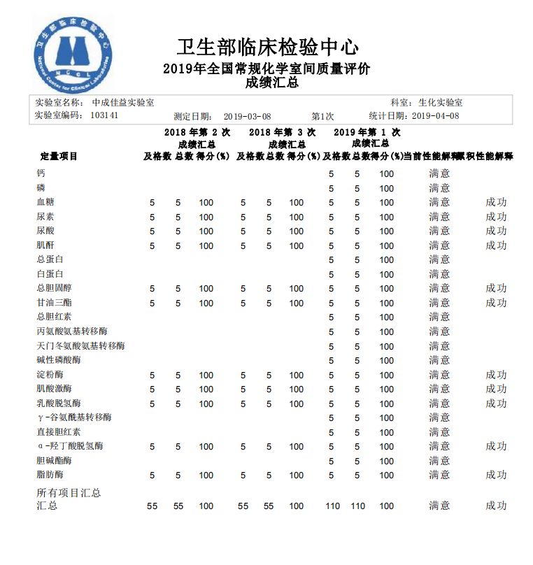 更新时间: 点击:10751 所属栏目:公司新闻 Update Time: Hits:10751 Belong Column:News近期,卫生部临床检验中心2019年全国第一次常规生化室间质量评价(简称室间质评)数据统计出炉,信鸿医疗子公司天津中成佳益生物科技有限公司以全满分的成绩通过!