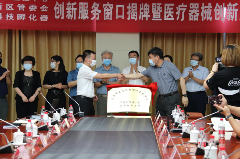 在区工信局、区市场监督管理局、区科技局、华明高新区及执信孵化器主要负责同志的共同见证下,市医疗器械审评查验中心主任唐楠与东丽区副区长李光华共同为创新服务窗口揭牌。